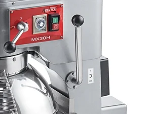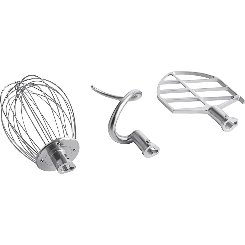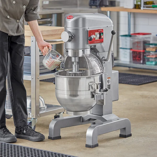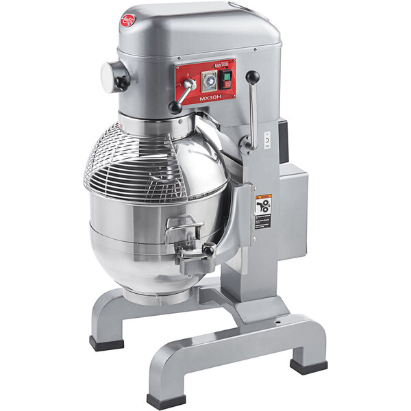 In addition to a 30 qt. type 304 stainless steel bowl, this mixer comes with a variety of other accessories, including a type 304 stainless steel wire whip for mixing liquids and soft foods, a cast aluminum flat beater for mixing dry ingredients, and a cast aluminum dough hook for kneading bread or pizza dough on low speed.